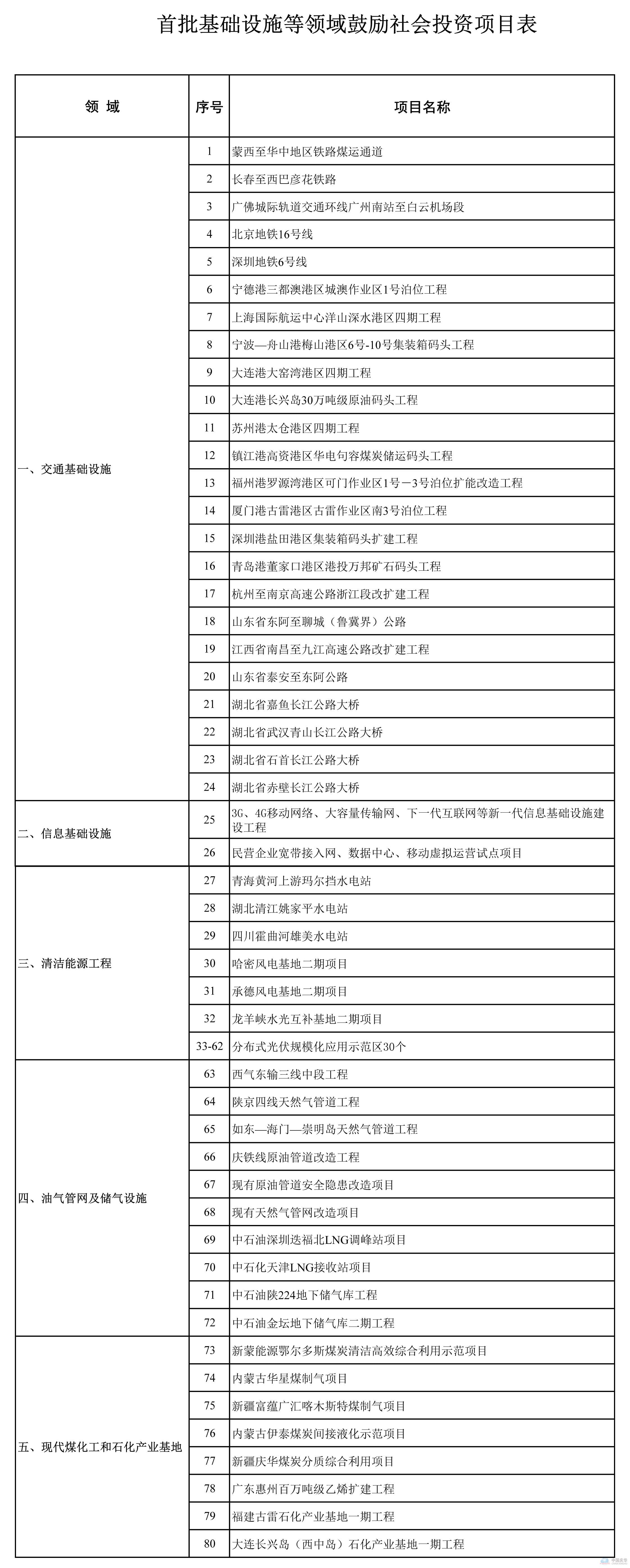 一、首批推出的基礎(chǔ)設(shè)施等領(lǐng)域鼓勵(lì)社會(huì)資本參與的80個(gè)項(xiàng)目涵蓋鐵路、公路、港口等交通基礎(chǔ)設(shè)施,新一代信息基礎(chǔ)設(shè)施,重大水電、風(fēng)電、光伏發(fā)電等清潔能源工程,油氣管網(wǎng)及儲(chǔ)氣設(shè)施,現(xiàn)代煤化工和石化產(chǎn)業(yè)基地等方面,鼓勵(lì)和吸引社會(huì)資本特別是民間投資以合資、獨(dú)資、特許經(jīng)營(yíng)等方式參與建設(shè)及營(yíng)運(yùn)。